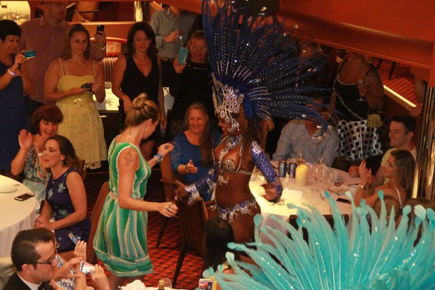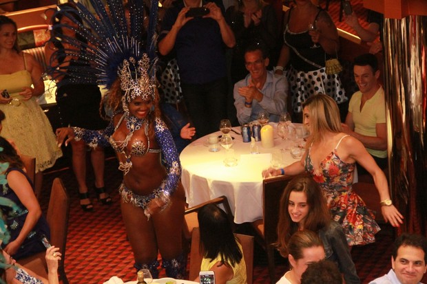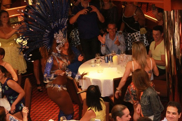 Durante jantar no navio Costa Pacífica, na noite desta quinta-feira, 21, Zezé Di Camargo e o ator Daniel de Oliveira foram surpreendidos por passistas que os colocaram para sambar.